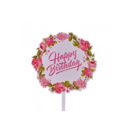 Топпер с цветами «Happy Birthday» прозрачный с розовой надписью TULA
