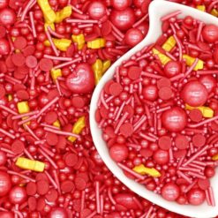 Посыпка-микс яркая посыпка в краных тонах, с частичками добавления золота. Содержит фигурки в виде сердца, соломки, конфетти и жемчуга различного размера и все в красном цвете, разбавляет микс красного цвета-золотые маленькие стрелочки.